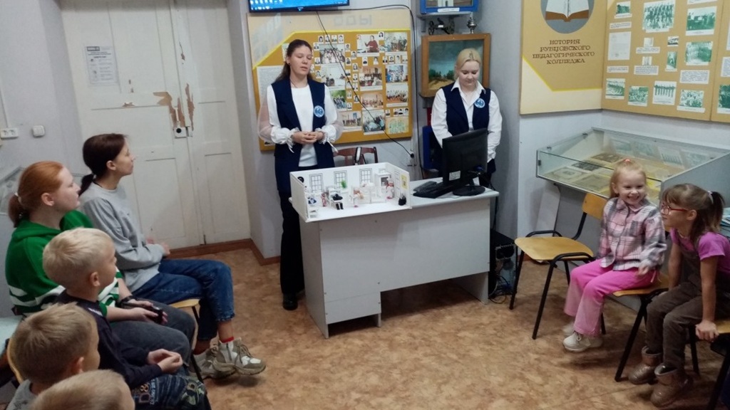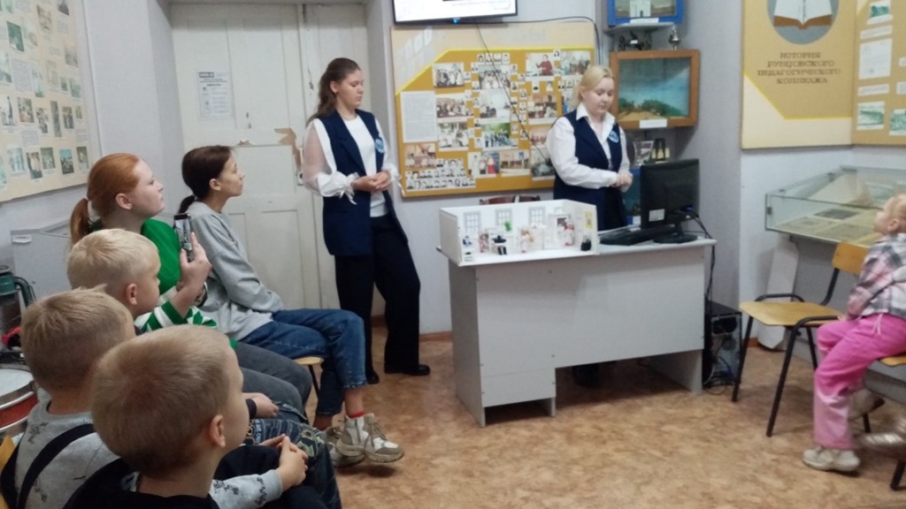 Для детей студентками группы «Поиск» (Дурейкина Анастасия, Новоселова Полина) была проведена очень интересная и познавательная экскурсия по музейной комнате с разными экспозициями, которые помогали ребятишкам понять и увидеть предметы бывших студентов и преподавателей, узнать интересные истории об отдельных экспонатах музея.