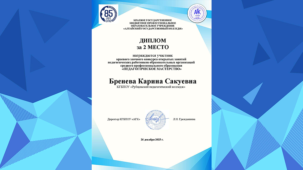 Преподаватель Рубцовского педагогического колледжа продемонстрировала высокий уровень профессионализма, результаты конкурса следующие: