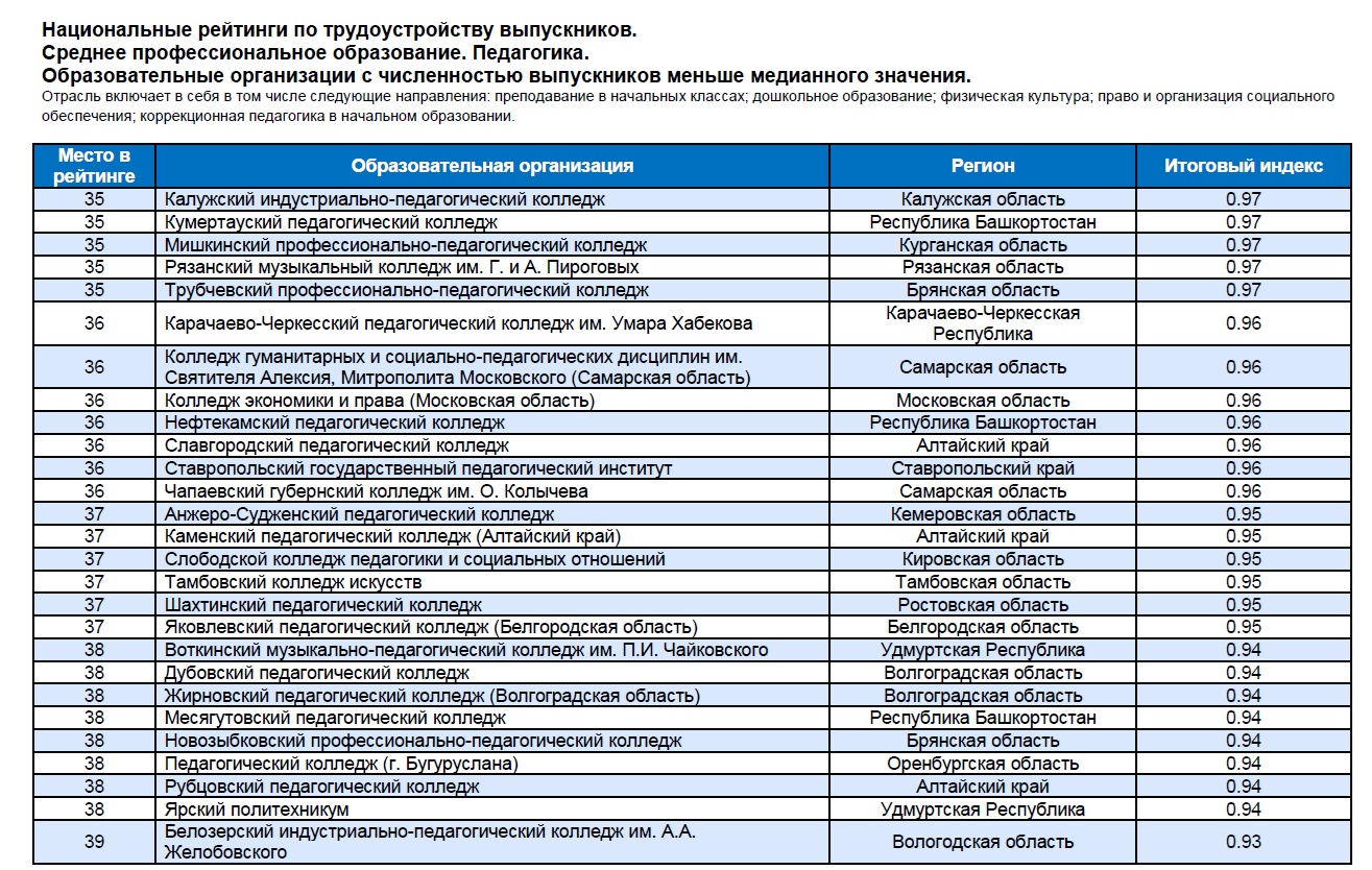 который разработан в рамках национального проекта «Кадры» и опубликован на портале «Работа в России». Колледж входит в список образовательных учреждений по трудоустройству выпускников меньше медианного значения по направлению «Педагогика».