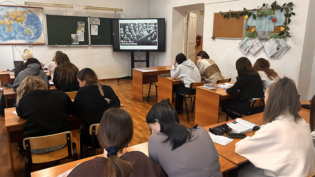 Студентам был представлен видеоурок «День начала Нюрнбергского процесса», показаны кадры кинохроники освобождения узников концентрационных лагеря Аушвиц (Освенцим).