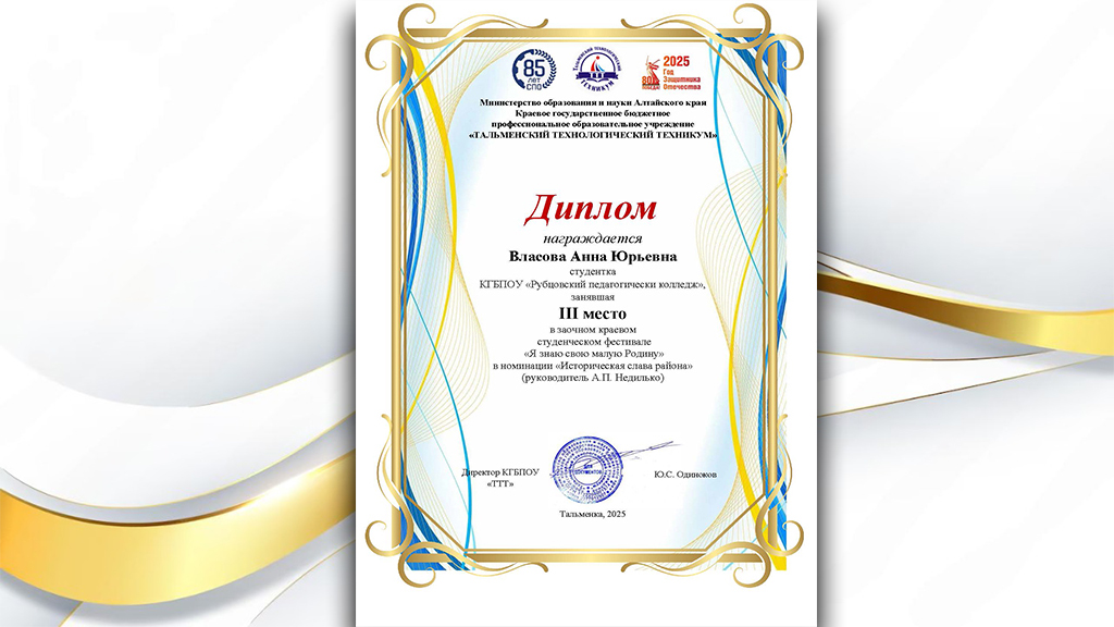 Поздравляем Георгия, Анну и Карину с заслуженными наградами! Ваши достижения – это гордость всего колледжа. Желаем не останавливаться на достигнутом и продолжать с таким же энтузиазмом изучать и представлять историю Алтайского края.